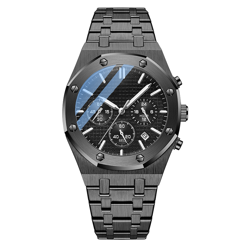 MULTI-FUNCTIONAL DIAL WITH ENHANCED READABILITY: A large main dial with three sub-dials displays hours, minutes, and seconds, plus a chronograph and calendar function. The clear layout ensures quick, accurate timekeeping for everyday use or active lifestyles.