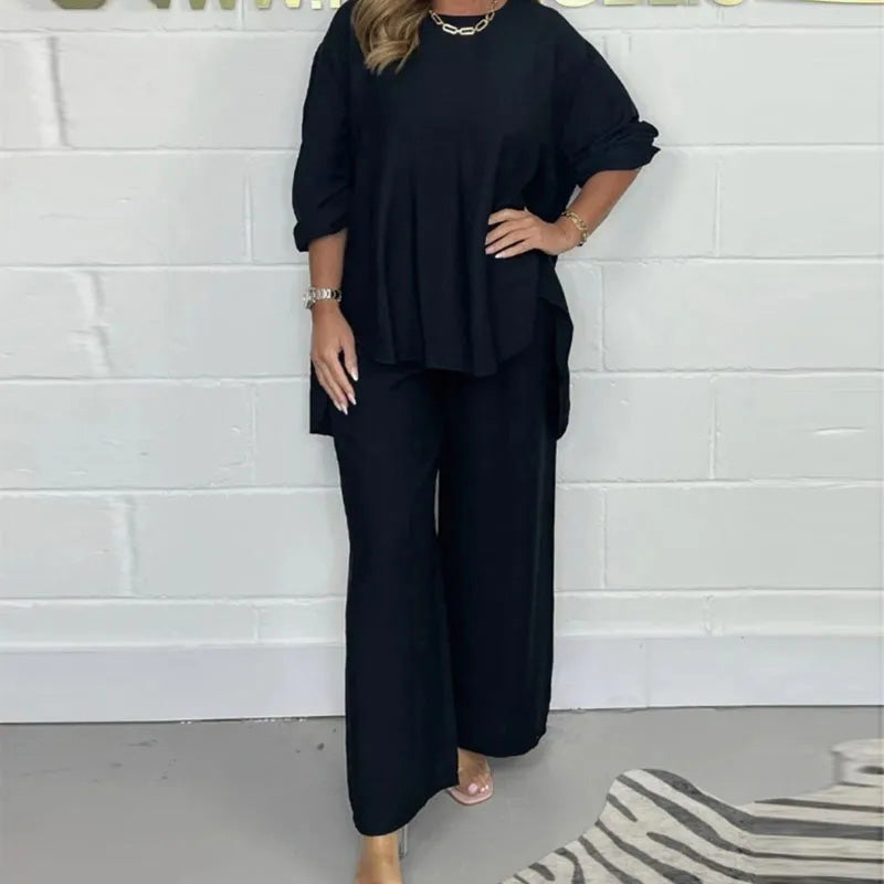 It is a versatile set consisting of trousers with long sleeves and wide legs, combining comfort and elegance for any occasion. Designed for a timeless appeal and a look without